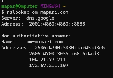 nslookup om-mapari.com3️⃣ Step 3: Connectivity Check — (Network Layer / ICMP)